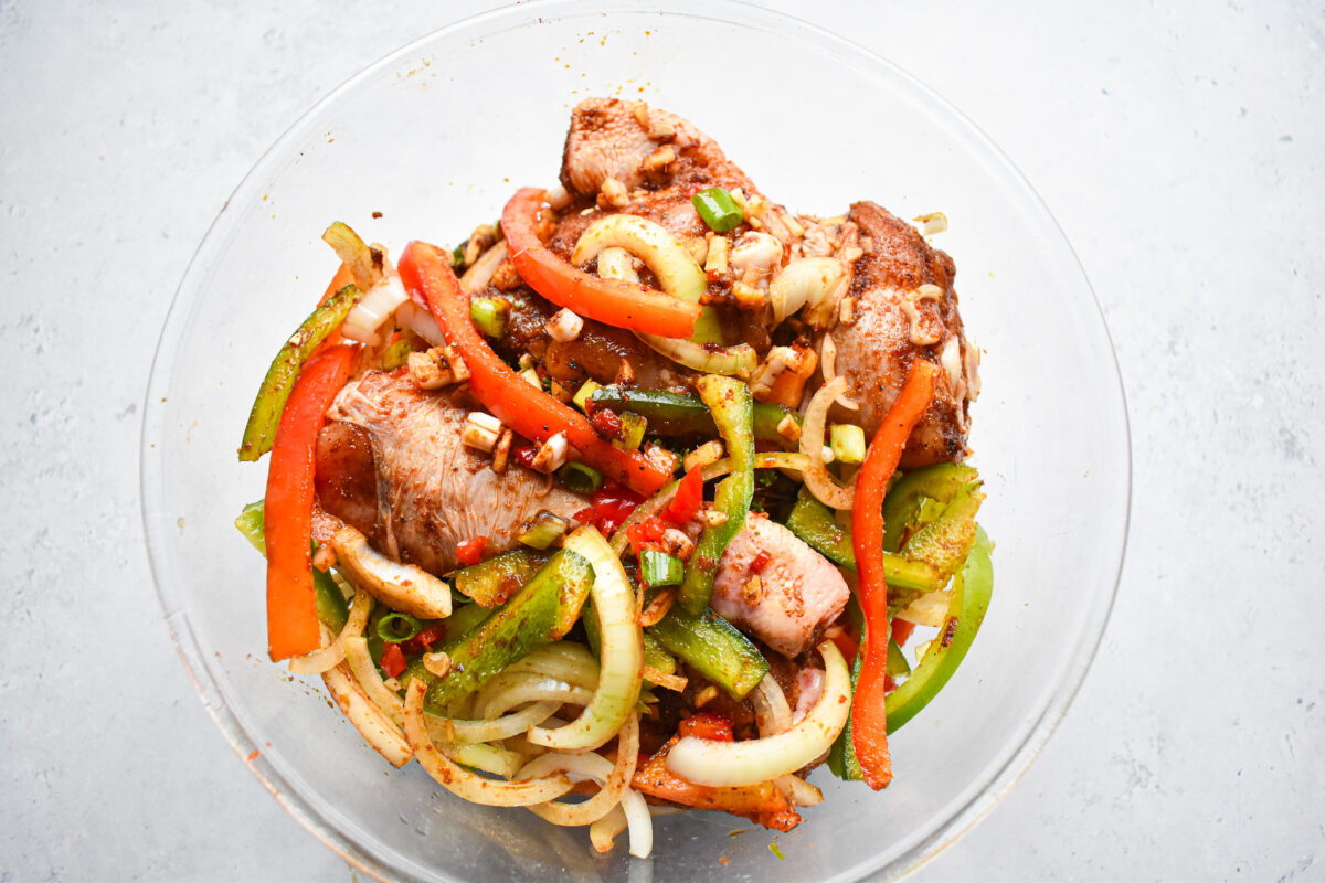 • Add in the onions, spring onions, garlic, ginger, green bell pepper, red bell pepper, scotch bonnet chilli and thyme. Mix well to coat every piece then cover and refrigerate for at least 2 hours or overnight for the best flavour.